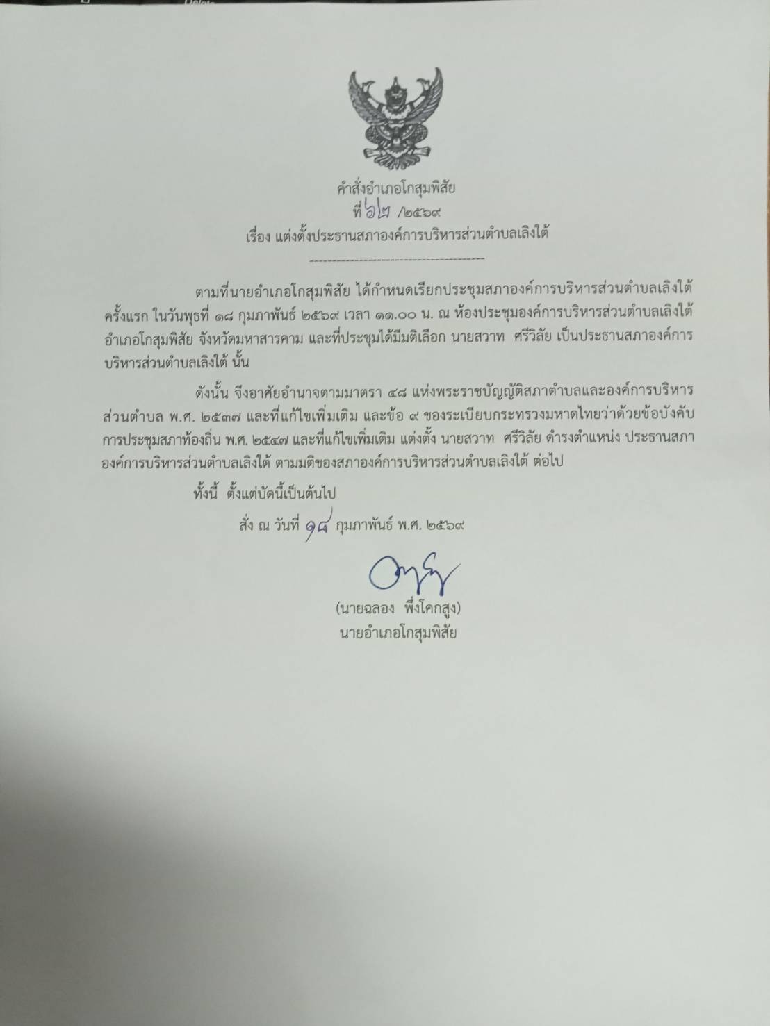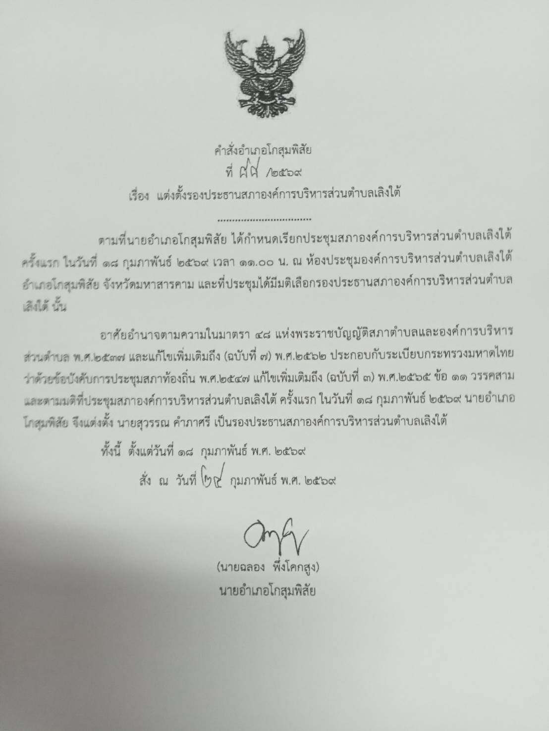 นายอำเภอโกสุมพิสัย ได้เรียกประชุมสภาองค์การบริหารส่วนตำบลเลิงใต้ ครั้งแรก เมื่อวันที่ 18 กุมภาพันธ์ 2569 เพื่อ คัดเลือกประธานสภาฯ รองประธานสภาฯ และเลขานุการสภาฯ